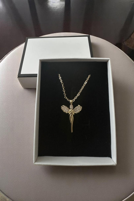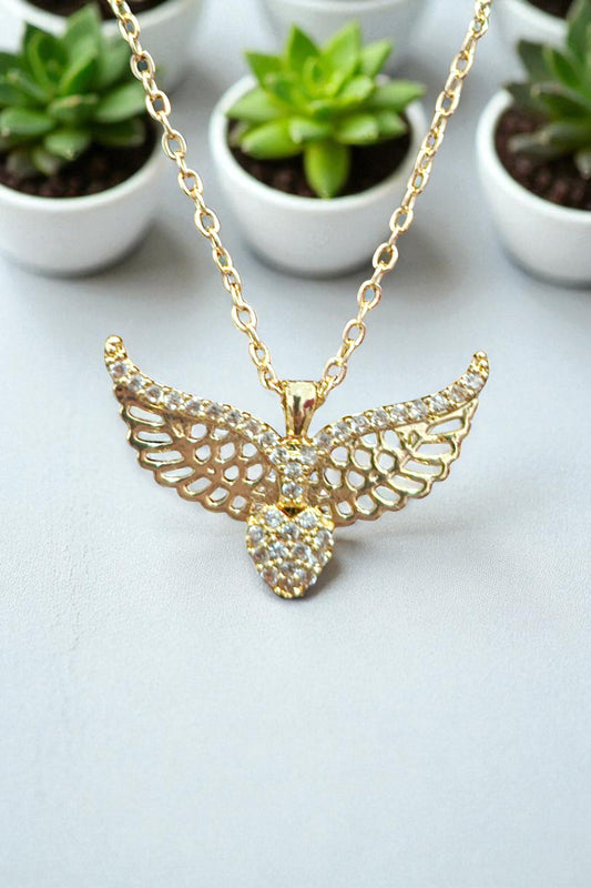 Taşlı Melek Kanatlı Kalpli Altın Renk Kolye Kutulu Kararmaz Zincir